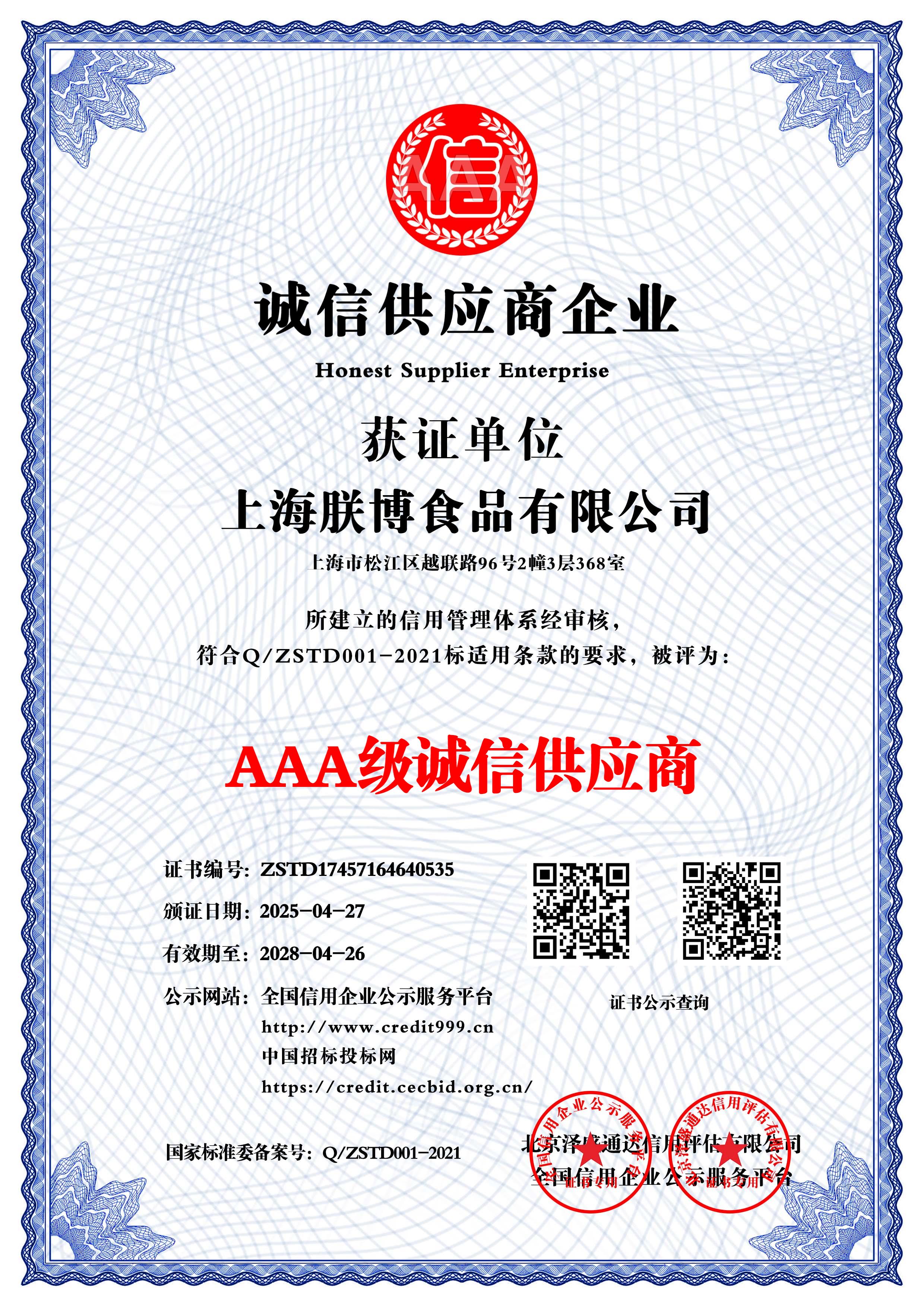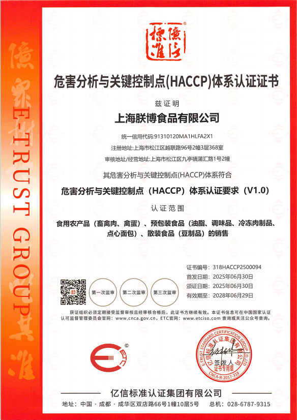 祝贺上海朕博食品有限公司(以下简称上海朕博)取得危害分析与关键控制点(HACCP)体系认证、AAA级诚信供应商等多个具有行业竞争的证书。
