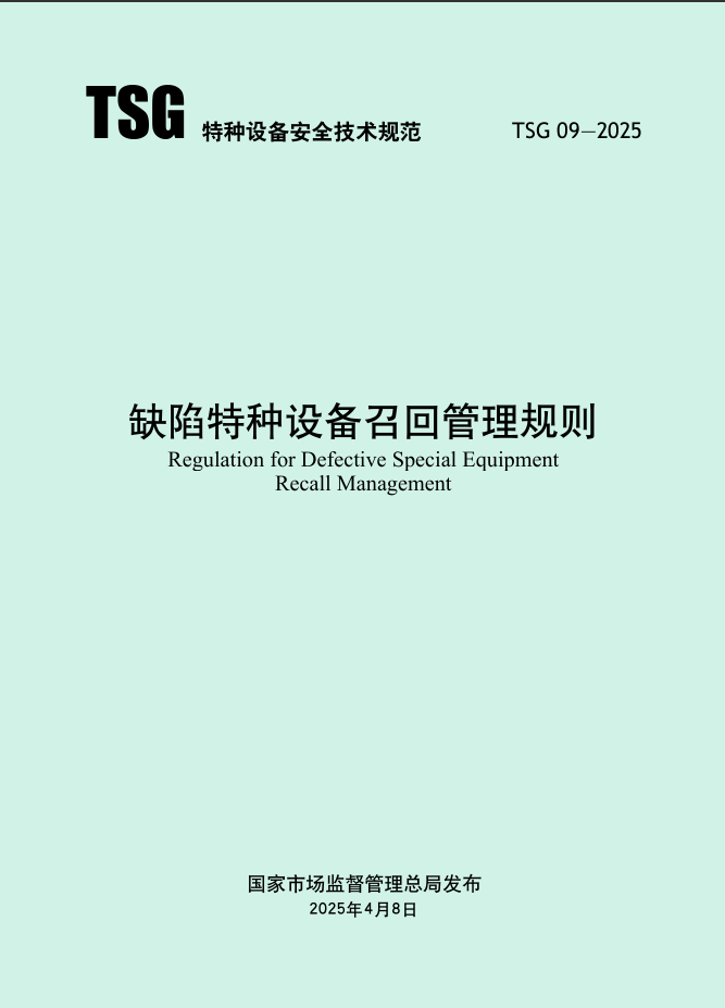 TSG 09—2025《缺陷特种设备召回管理规则》于2025年4月8日发布,将于2025年8月1日开始实施。《规则》明确了召回责任主体、缺陷调查及信息收集、召回实施、召回监督等管理细则。