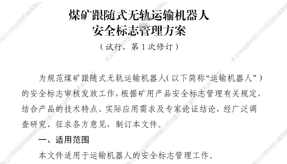 近日,国家安标中心发布安标国家中心〔2026〕8号,更新了《煤矿跟随式无轨运输机器人安全标志管理方案(试行)(第1次修订)》等5项文件,事关企业资质申办、证书维护全流程。